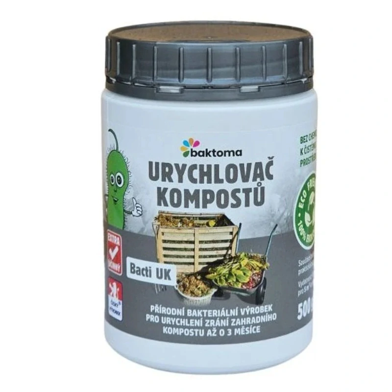 Zcela přírodní a ekologický bio-aktivní výrobek Bacti UK urychlovač kompostu je určený k urychlení kompostování. Obvyklá délka kompostování je v rozsahu jednoho roku. Výrobek Bacit UK umí značně urychlit proces zkompostování zahradního odpadu a vybraného biologického odpadu z Vaší domácnosti. Bacti UK je směs bakteriálních kultur smíchaných s nezpracovanými enzymy, emulgátory a živinami, speciálně navržená pro zkompostování organických odpadů (odpad po prořezávce - štěpka, kůra, piliny, tráva, listí, ovoce, zelenina, květiny, bioodpad z domácností apod.). Výrobek funguje ve dvou fázích: urychlení nastartování a výrazné zkrácení celého procesu kompostování. Při použití Bacti UK dochází k maximalizaci hnojících hodnot kompostu. Výsledek urychlení kompostování s Bacti UK je po cca 60ti dnech od první aplikace přípravku.